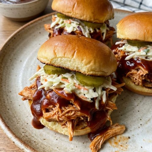 There’s something irresistibly satisfying about bite-sized sandwiches that still deliver big flavor. The chicken here is juicy and tender, bathed in a glossy BBQ glaze that caramelizes a touch as it warms. The slaw adds a cool, creamy contrast with just a hint of acidity to balance the sweetness of the sauce. And the slider buns provide the perfect handheld experience—soft, slightly sweet, and sturdy enough to hold the fillings without falling apart.