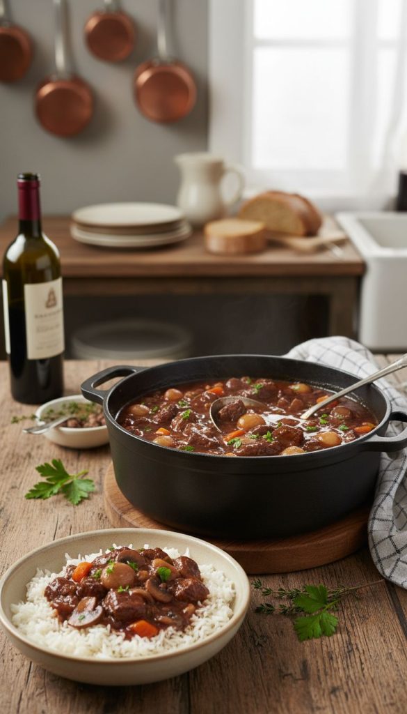 Comforting Beef Bourguignon and Rice Recipe – Cozy One-Pot Style Dinner