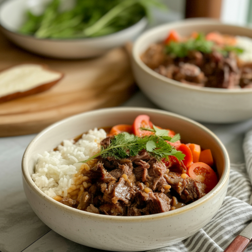 This brisket bowl brings together everything people love about a comforting meal: rich, slow-cooked beef; a warm, starchy base; and fresh, vibrant toppings that keep each bite interesting. The beef brisket is seasoned with a simple mix of kosher salt, black pepper, smoked paprika, ground cumin, and garlic powder, then gently cooked in a flavorful bath of beef broth, soy sauce, apple cider vinegar, brown sugar, and minced garlic.