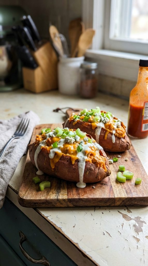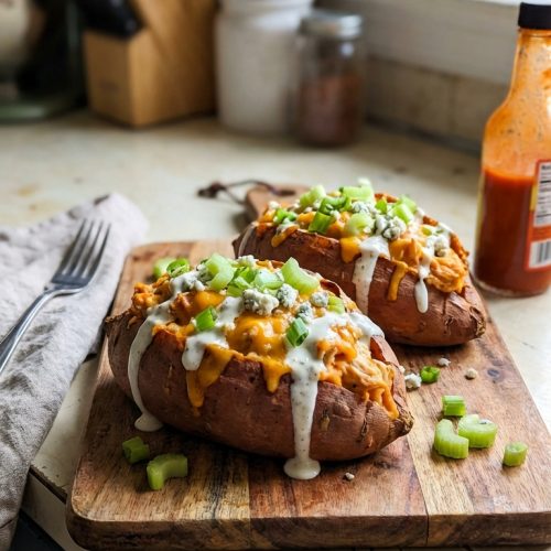 There’s something genuinely satisfying about taking a humble sweet potato and turning it into a complete meal. The natural sweetness of the potato balances the heat of the buffalo sauce, while the shredded chicken provides that juicy, savory protein you’re craving. The dish is comforting yet bright, thanks to the celery, green onions, and a drizzle of cool ranch or blue cheese dressing. It’s also incredibly versatile: you can tweak the level of spice, switch to dairy-free dressing, or add extra veggies for a fiber boost. It’s the kind of recipe that feels like a recipe you could improvise, which makes it perfect for cooks of all levels.