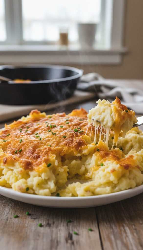 Creamy mashed potatoes blended with sharp cheese and butter, then finished under high heat to create a golden, crispy top — the ultimate comfort side dish for weeknights and holidays.