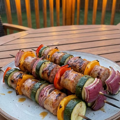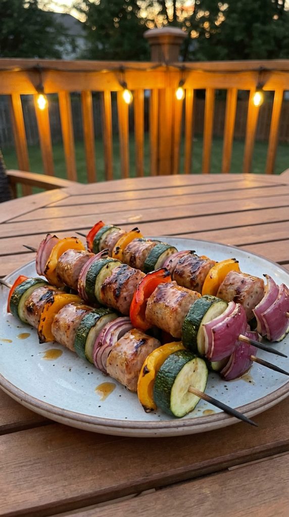 Grill time: Place the skewers on the grill. Cook for 8–12 minutes, turning every 2–3 minutes, until the vegetables are tender-crisp and the sausage is heated through with a gentle char.