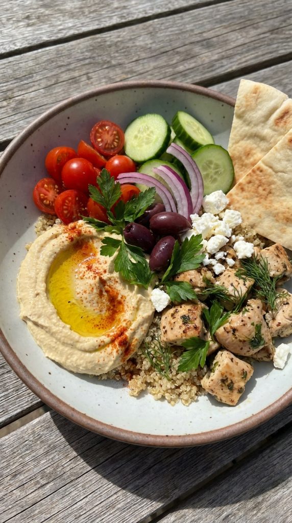 - Assemble the bowls: start with a bed of greens, add a scoop of quinoa, then layer hummus in a swirl. Top with sliced chicken, cucumber, tomatoes, red onion, and olives. Drizzle with the lemon dressing and finish with a squeeze of lemon and pepper to taste.