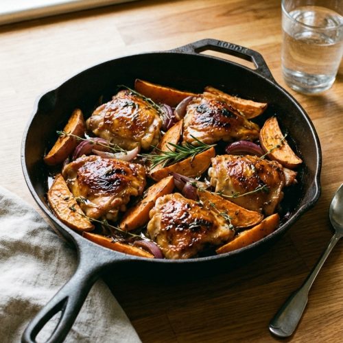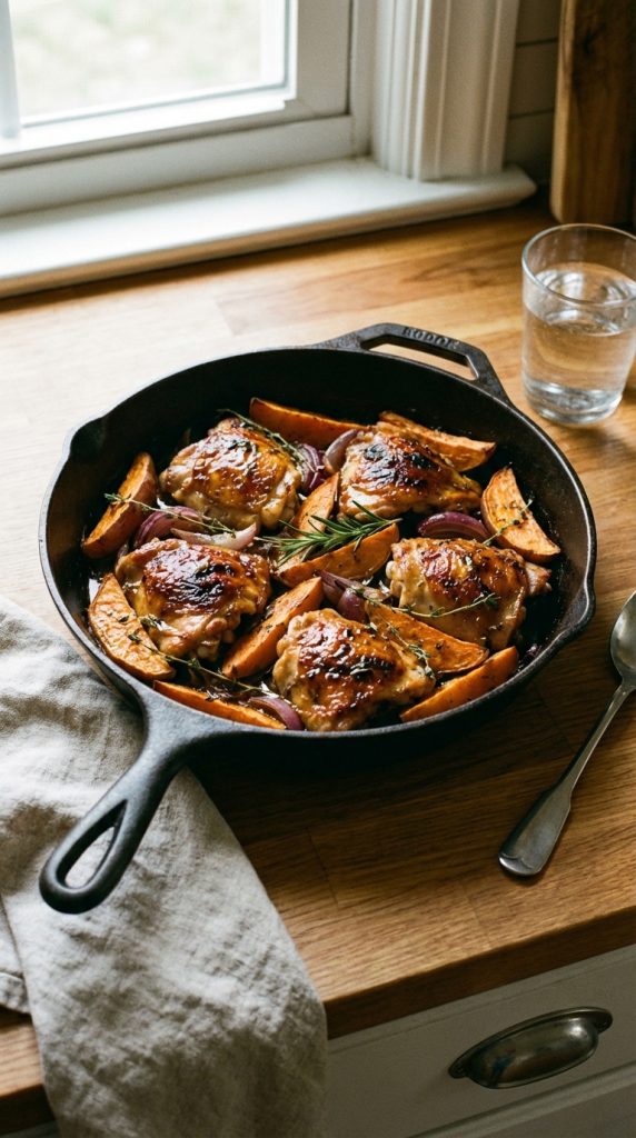 - Dish readiness: the skillet-pan dinner is ready once the internal temperature of the chicken thighs reaches 165°F (74°C) and the sweet potatoes are easily pierced with a fork.