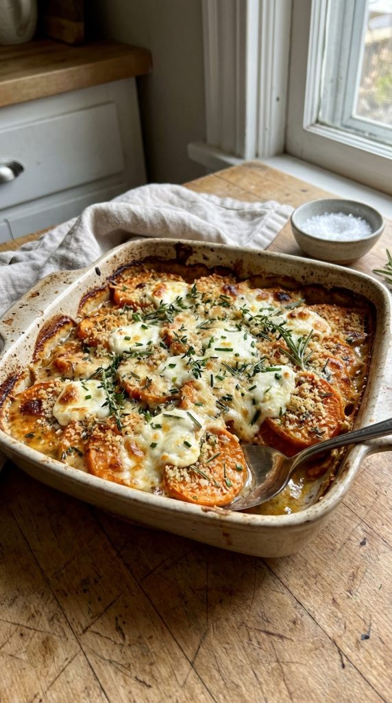 Savory Herb and Goat Cheese Scalloped Sweet Potatoes