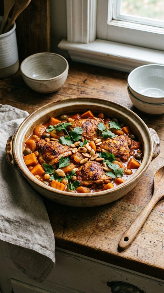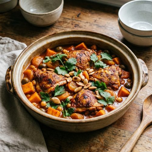 What you can expect from this recipe is a tender, juicy chicken that practically falls off the bone, teamed with creamy chunks of sweet potato and briny olives that give bursts of savory brightness. The spice blend—cumin, cinnamon, coriander, paprika—creates that unmistakable North African warmth without overpowering the dish. The result is a one-pot supper that is comforting, nourishing, and reliably delicious, whether you’re feeding a family or enjoying leftovers later in the week.