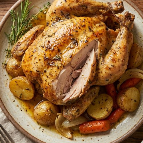 Carrots, potatoes, or rice work beautifully as sides. Use the pan juices as a simple gravy, or whisk in a splash of cream for a richer finish.
