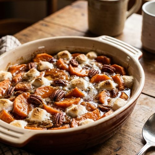 From the very first bite, you’ll notice how the glaze clings beautifully to the potatoes, giving them a shiny appearance and a rich, toasty sweetness. The maple brings a light, nuanced sweetness that doesn’t overpower the natural earthiness of the potato, while the brown sugar deepens the flavor with a caramel-like warmth. A pinch of cinnamon adds warmth that pairs perfectly with the savory edge of the dish, and a splash of vanilla lifts the glaze, giving it a rounded finish. The result is a dish that’s at once familiar and slightly elevated—a Southern classic that feels cozy, accessible, and totally irresistible.
