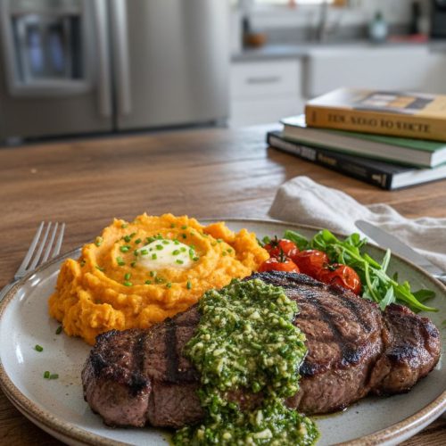 This dish pairs two complementary flavor worlds: bold, savory steak and vibrant, fresh herb sauce, anchored by the mellow sweetness and creaminess of mashed sweet potatoes. The green sauce wakes up every forkful with acidity and herb aromatics, while the potatoes soften the experience — it’s both comforting and lively. It’s also flexible: swap herbs, use different steak cuts, or adjust spice levels to match what you like.